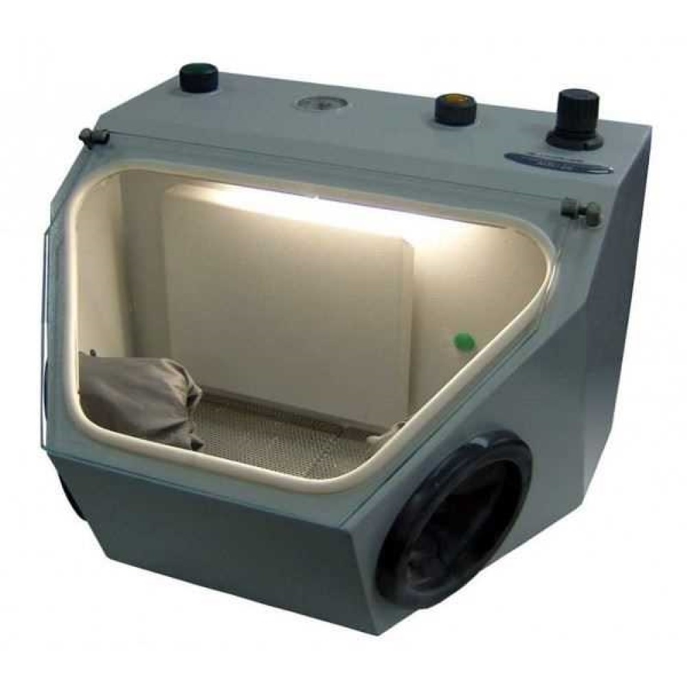 Пескоструйный аппарат, предназначенный для тонкой очистки поверхностей коронок и мостов, керамики и стеклокерамики. Имеет два бункера для абразивного материала с размерами частиц 50-100 мкм и 100-250 мкм, хорошо освещенную камеру и встроенную систему очистки воздуха в рабочей камере. Снабжен шлангами и соплами высокой износостойкости.