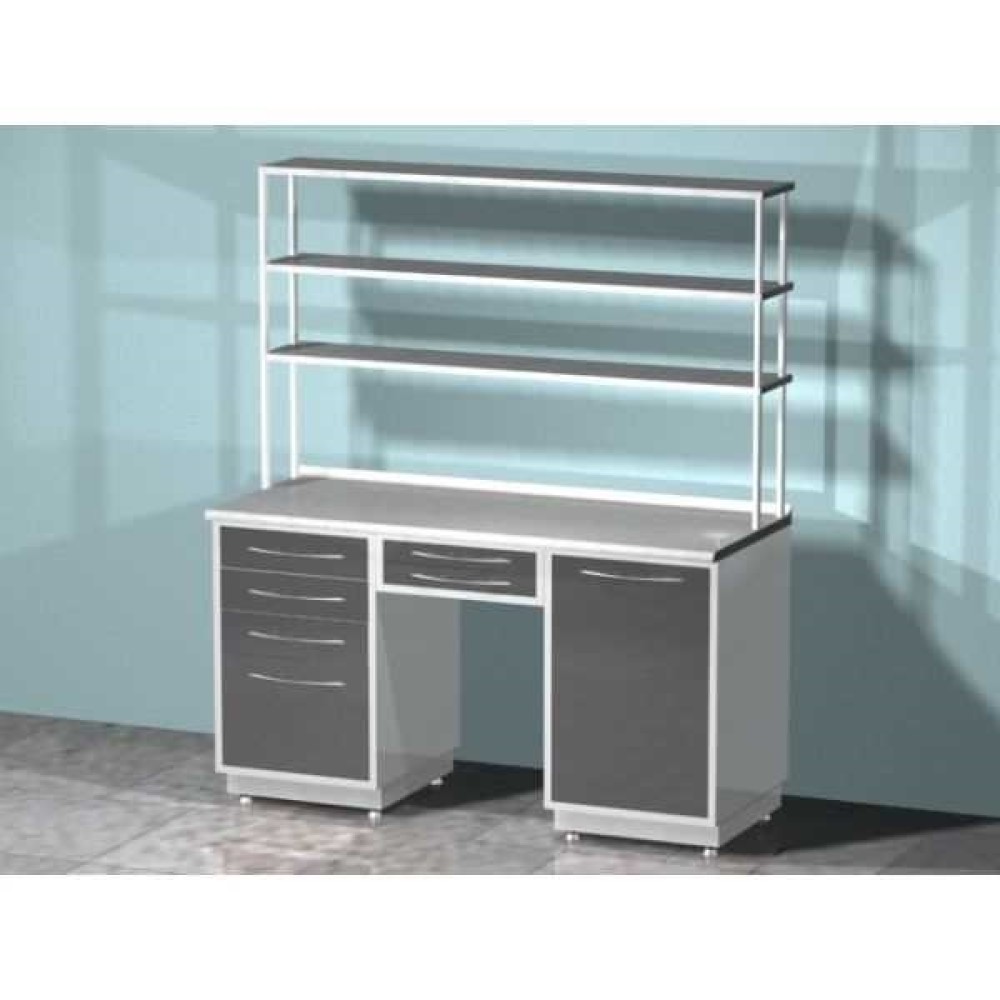 AR-L05N - стол лабораторный со стеллажом двухтумбовый (тумба с распашной металлической дверью, тумба с четырьмя выдвижными ящиками, два выдвижных ящика между тумбами), на столешнице стекло