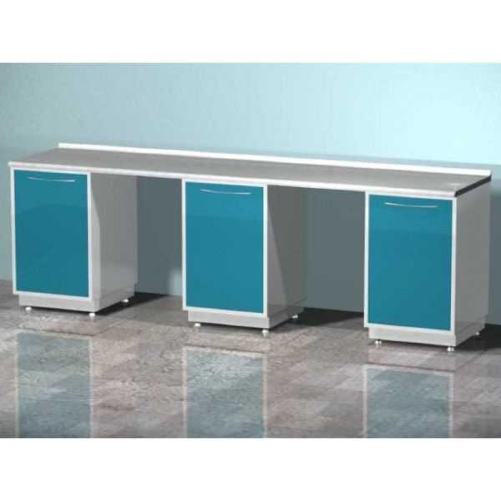 AR-L21 - стол лабораторный трехтумбовый (три тумбы с распашными металлическими дверями), на столешнице стекло