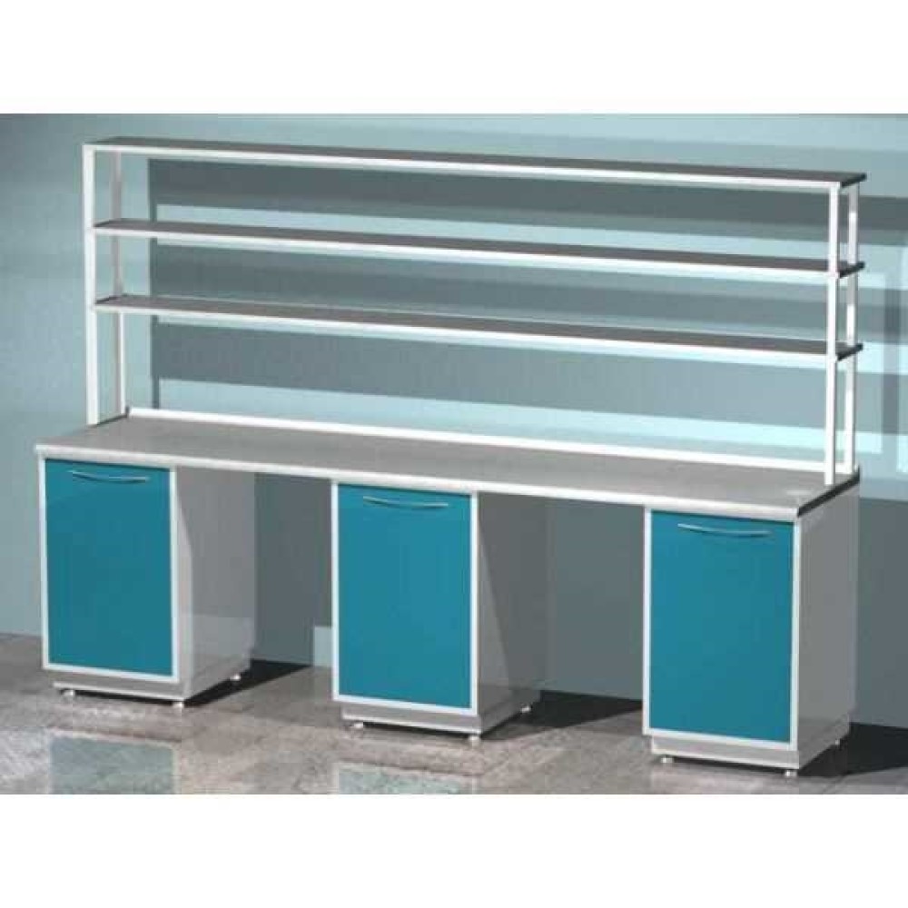 AR-L21N - стол лабораторный со стеллажом трехтумбовый (три тумбы с распашными металлическими дверями), на столешнице стекло