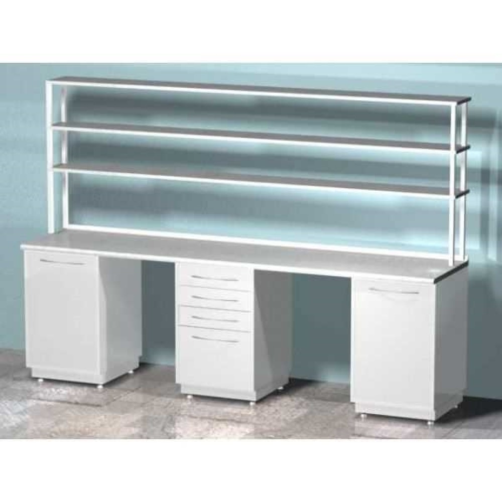 AR-L22N - стол лабораторный со стеллажом трехтумбовый (две тумбы с распашными металлическими дверями, тумба с четырьмя выдвижными ящиками), на столешнице стекло
