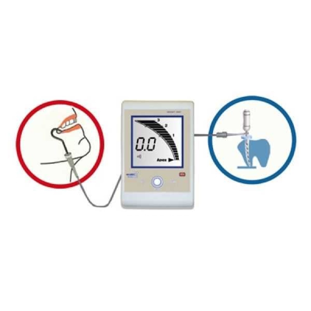 Апекслокатор осуществляет локализацию верхушки корня зуба путем измерения комплексного электрического сопротивления между двумя электродами. Один из электродов представляет собой металлический крючок (загубник), размещаемый на губе пациента, а другой электрод (щуп) присоединяется к металлической части эндодонтического инструмента (файлу), введенного в корневой канал исследуемого зуба.