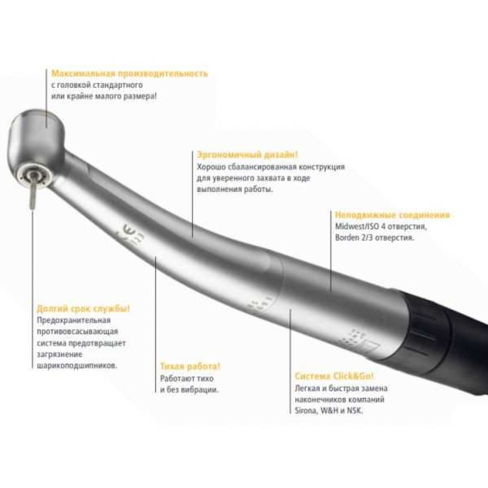 | Предохранительная противовсасывающая система предотвращает засасывание слюны. Это предохраняет шарикоподшипники и зажимной патрон от загрязнения и гарантирует долгий срок жизни. | |