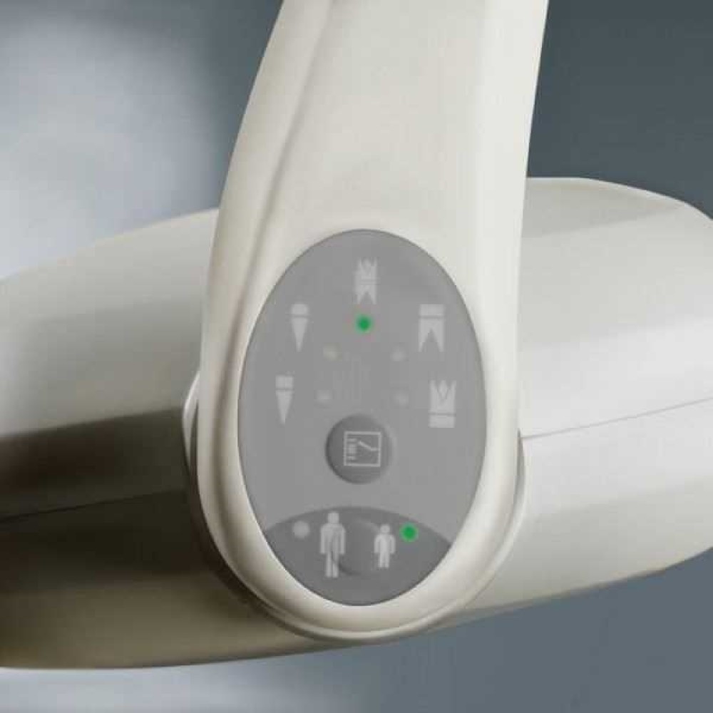 - Удобная система управления: выносная панель управления, позволяющая пользователю выбирать тип пациента (взрослый/ребенок), анатомическую зону съемки (резец, премоляр, верхний моляр, нижний моляр, прикус) и режим съемки (пленочный/цифровой),