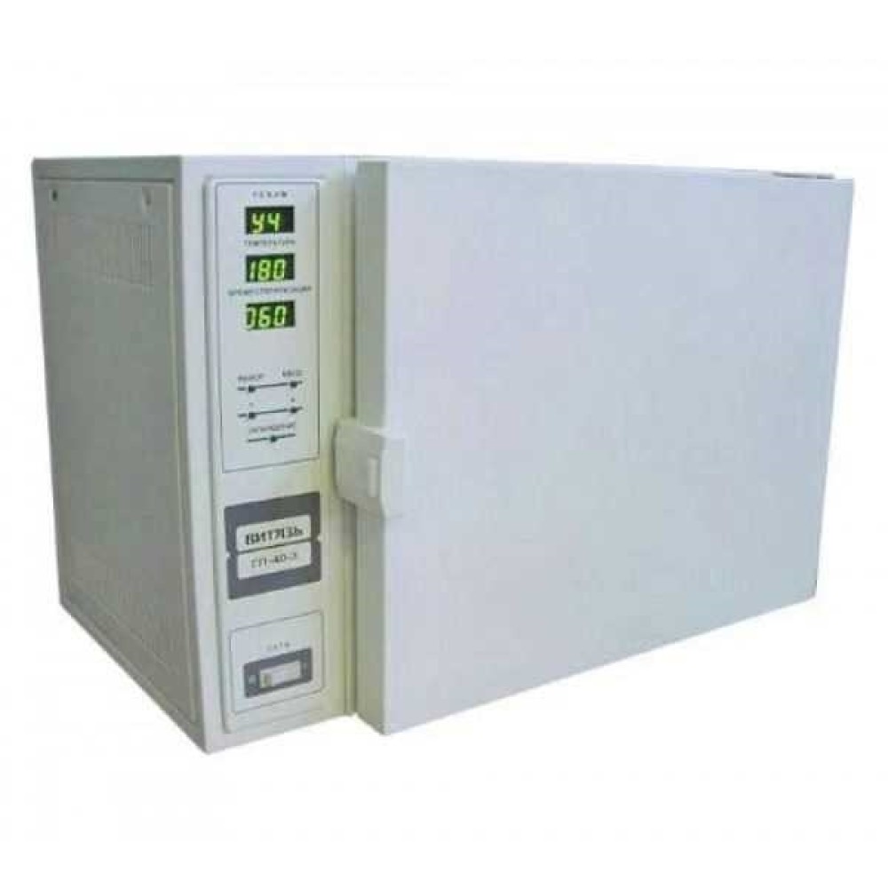 Сухожаровой стерилизатор. Современное оборудование для стабилизированной термической обработки материалов в воздушной тепловой среде, стерилизации, дезинфекции и сушки горячим воздухом хирургических инструментов, стеклянной посуды, изделий медицинского и другого назначения. Рабочий объём 40 л