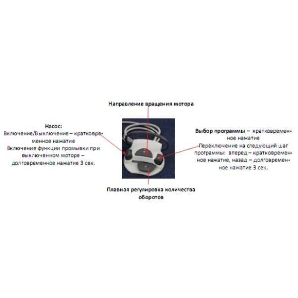 - Программирование следующих параметров каждого этапа операции: скорость мотора, мощность мотора, направление вращения мотора, мощность работы помпы для подачи физраствора.