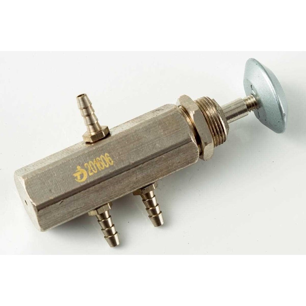 Переключает источник подачи воды от бутылки или водопровода, имеет металлический шток для регулировки.