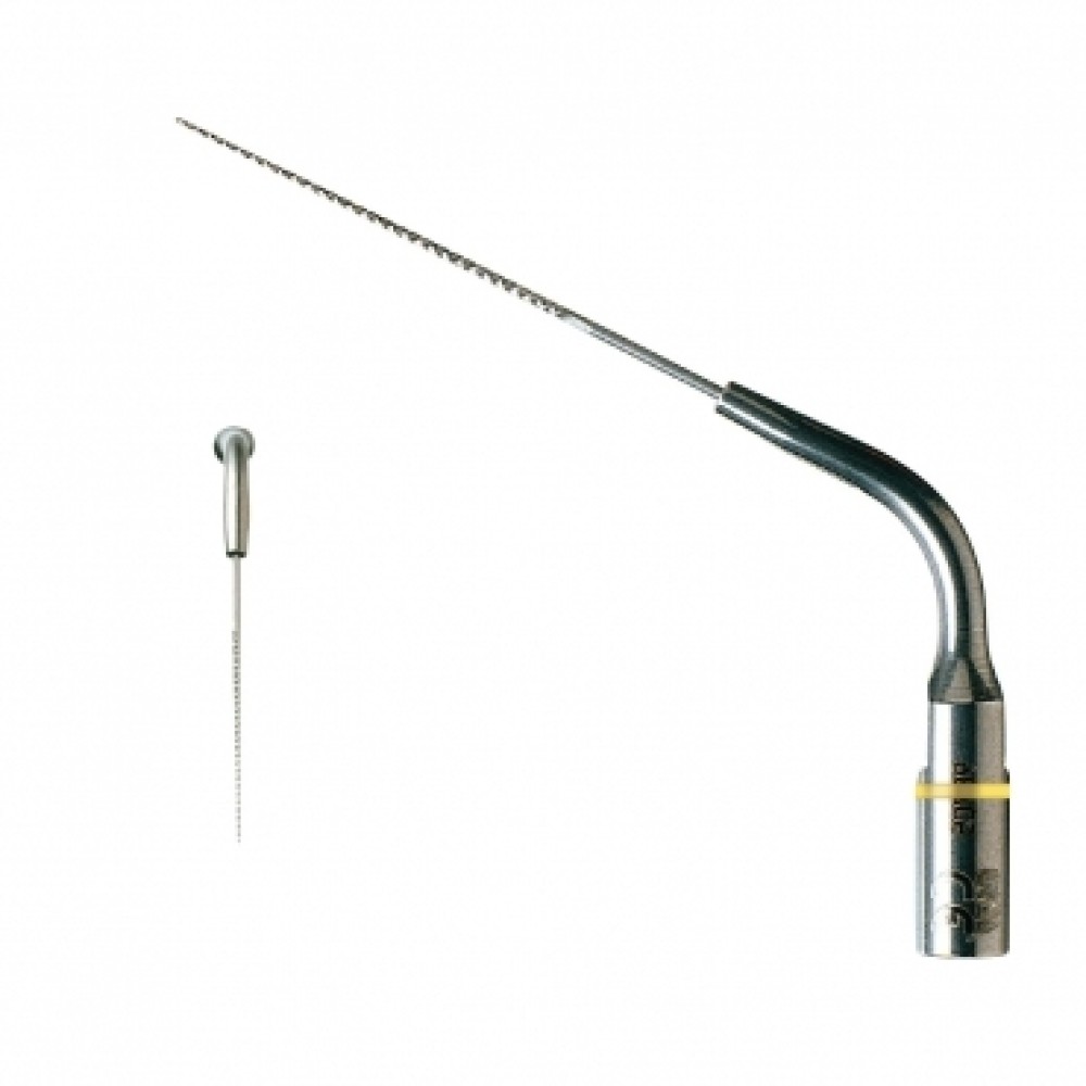 Стандартный K-file, диаметром 2,5мм, длина рабочей части 25мм. В сечении - квадрат, рабочая часть образована 4 спиралевидно закрученными гранями функционального стержня. Стержень зажат в теле угловой насадки, обеспечивающий удобное введение функционального стержня при стандартном эндодонтическом доступе в пульповую камеру зуба. Ультразвуковые колебания насадки снимают необходимость вращательных движений в канале. Рекомендуется аккуратное равномерное продвижение инструмента на рабочую глубину корневого канала без длительных остановок насадки в какой-либо точке во включенном состоянии, во избежании формирования уступа кончиком насадки на стенке корневого канала в области его изгиба.