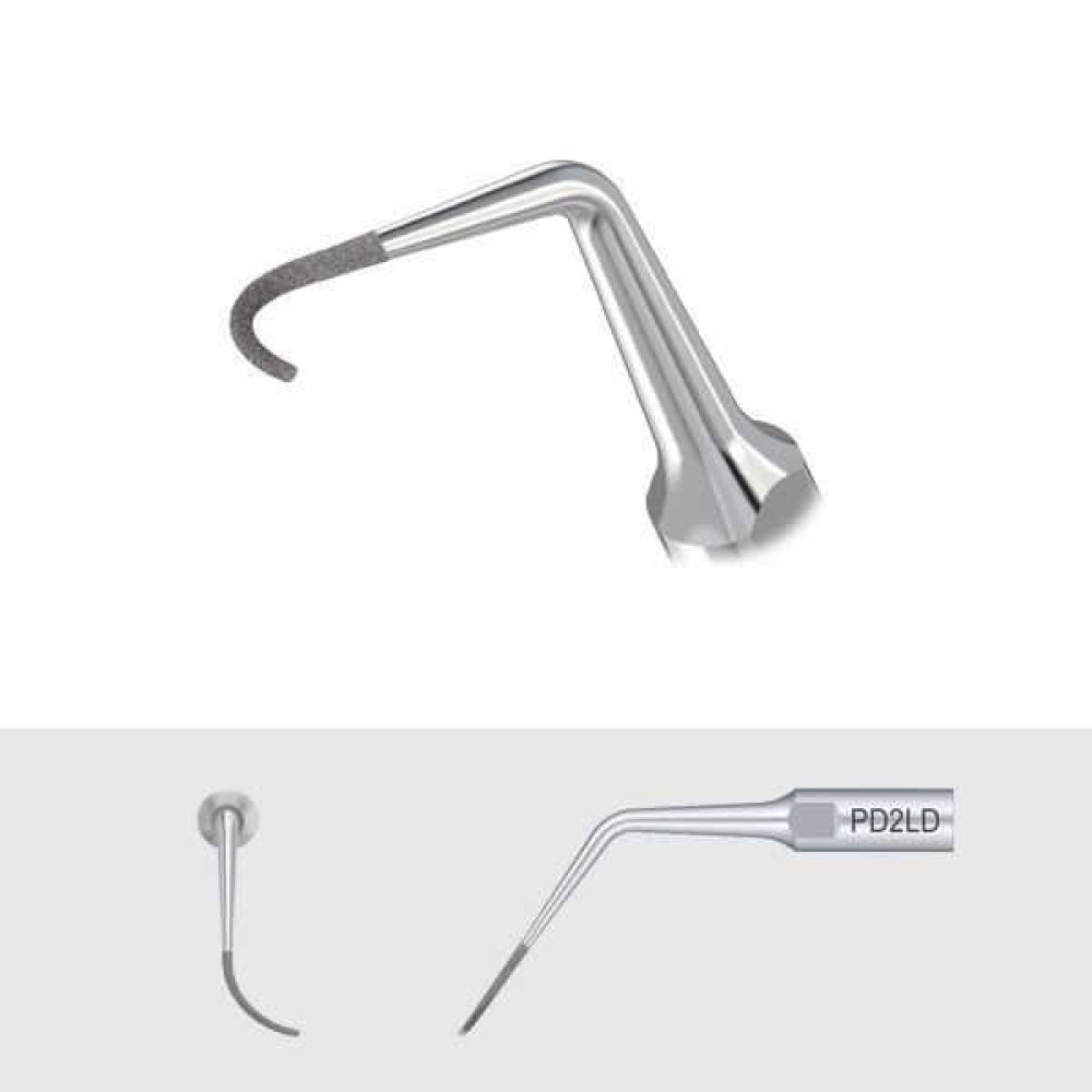 Насадка PD2LD с алмазным покрытием (40 мкм), изогнутая под углом в левую сторону, для удаления зубных отложений в области шейки зуба и коронарной трети корня зуба.