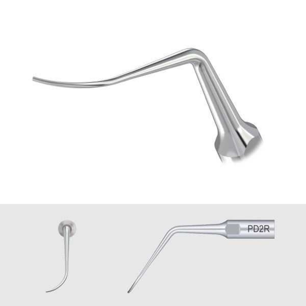 Насадка PD2R, изогнутая под углом в правую сторону, используется для очистки области фуркации от зубных отложений.