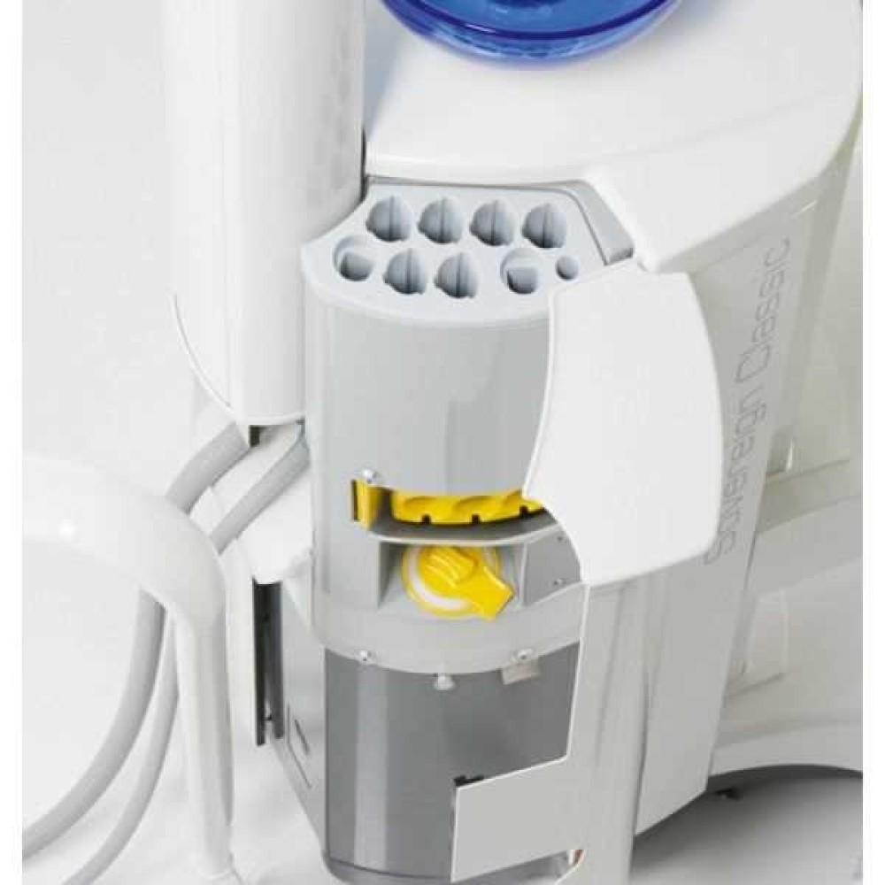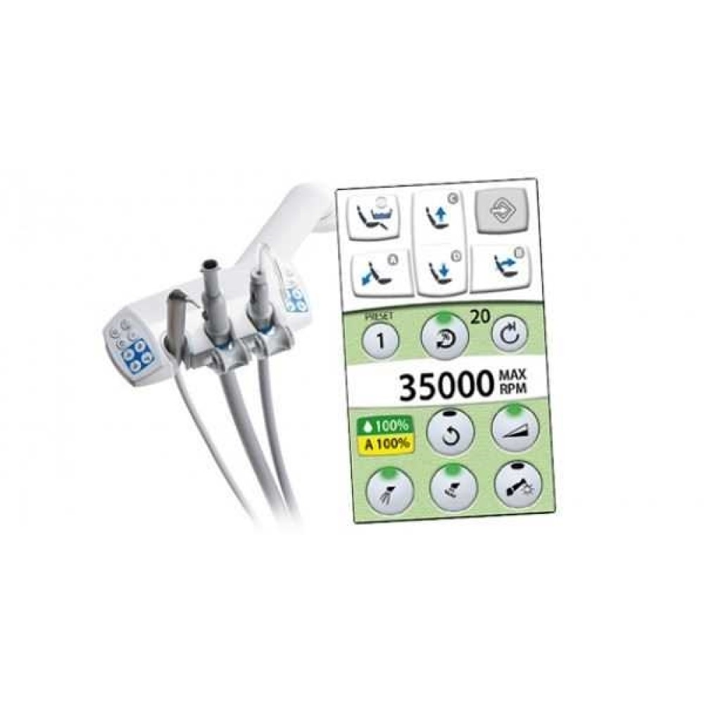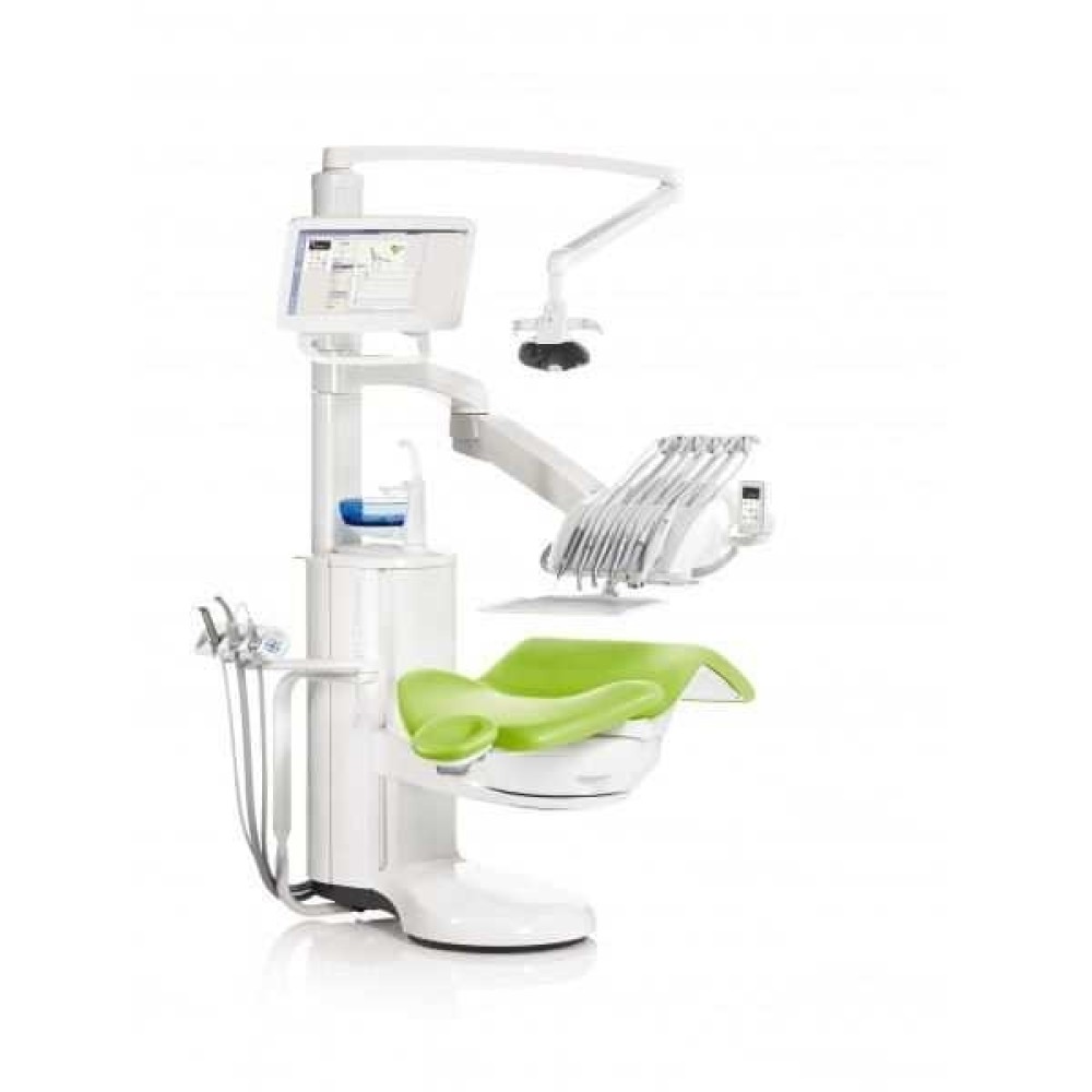 Настройте свою установку персонально под Вас посредством простого многоязычного сенсорного экрана. Подключите нужные инструменты на 6-позиционную консоль и используйте установку легко с первого дня. Расположите установку по желанию для лево/правосторонней работы ручной функцией поворота блока плевательницы и кресла. Удобный и модульный держатель шлангов аспирации и дополнительных инструментов Flexy обеспечит все Ваши потребности в лечении.