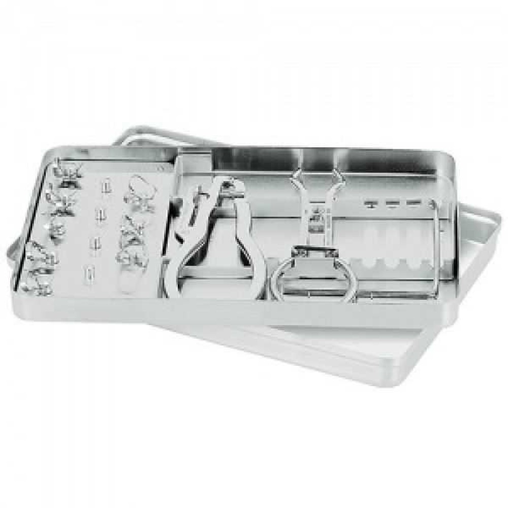 Поднос с инструментами Раббер Дам, нержавеющая сталь (поднос, вкладка под крепления, вкладка под инструменты, 8 креплений, щипцы)