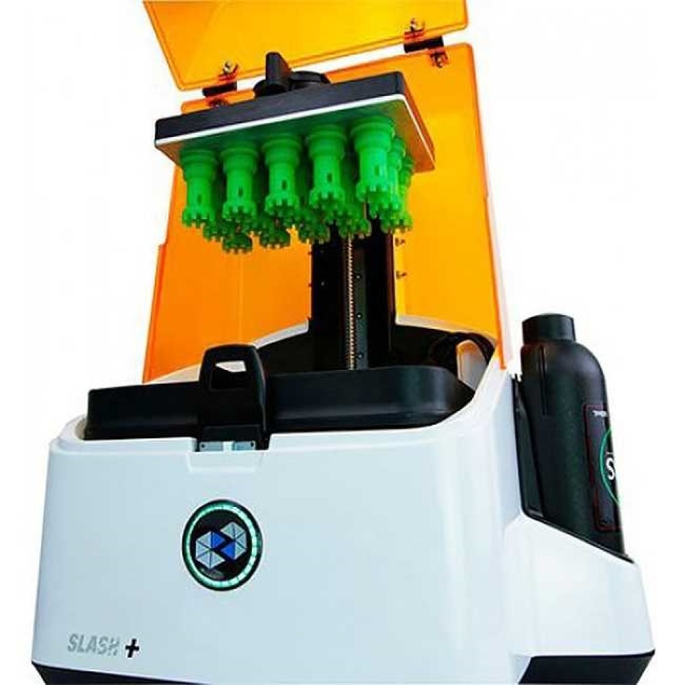 SLASH PLUS – один из наиболее быстрых настольных 3D принтеров на сегодняшний день, использующих стереолитографическую технологию. Разработанный функционал принтера позволяет производить модели с большим отпечатком. Данная модель имеет относительно недорогую стоимость на фоне своих преимуществ. Лидирующим преимуществом является ЖК-стереолитография, позволяющая добиться высокой печатной площади. Исчезает проблема с масштабированием, так как разрешение и прецизионность печати теперь независимы от размера маски, а свет генерируется светодиодным массивом. Работа Uniz основана на применении смол, полимеризирующихся в светодиодном свете. Следующим преимуществом данного принтера является его скорость печати. Для того, чтобы сохранять скорость печати в высоком темпе для принтера была разработана система засветки с применением водяного охлаждения. Это позволило увеличить производительность устройства до 1000 см3/час. Принтер работает с оригинальным интуитивно понятным программным обеспечением и облачной платформой. Программное обеспечение позволяет контролировать работу нескольких принтеров с одного компьютера одновременно. Он оснащен интерфейсом, допускающим удаленное управление со смартфона либо планшета.