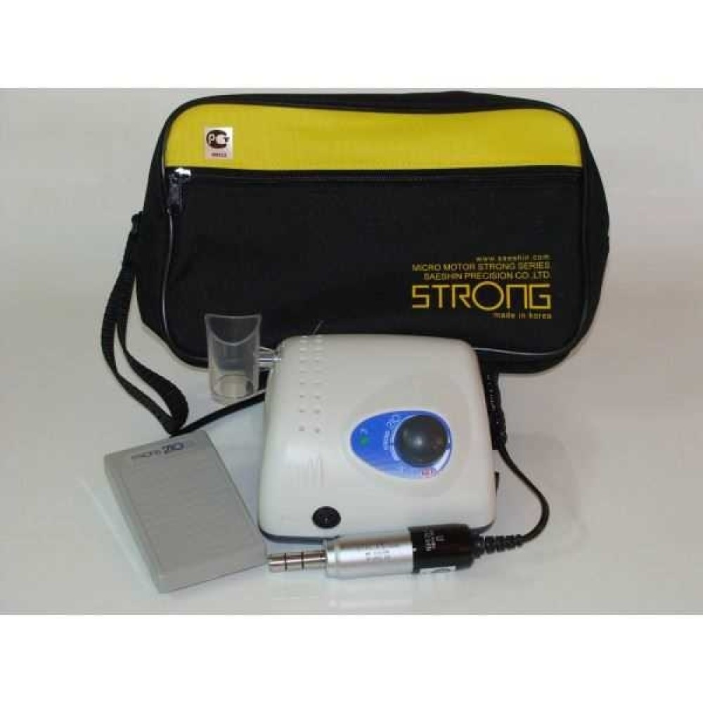 Микромотор STRONG 108NE: Щеточный, скорость вращения 40000 об/мин, мощность 65W. Применим с любыми видами прямых и угловых наконечников. Блок управления STRONG 210: Плавная регулировка скорости вращения наконечника, реверс, ручное/ножное управление. Технические характеристики: