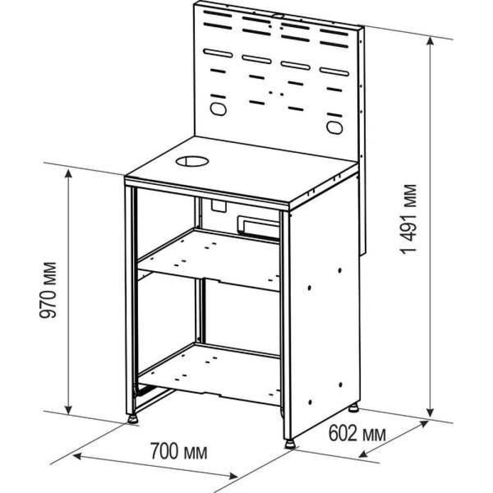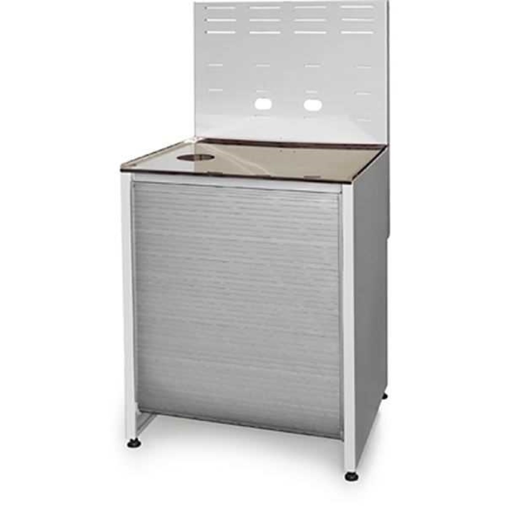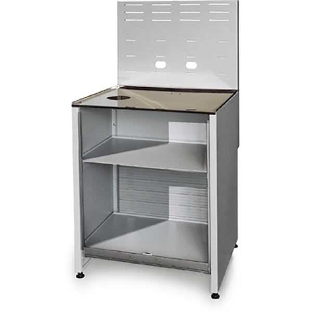 Специализированный гипсовочный стол для организации рабочего места по изготовлению гипсовых моделей. Столешница из нержавеющей стали с технологическим отверстием для сбора отходов. Под столешницей закрытое полезное пространство с двумя полками. Возможность установить на верхнюю полку под отверстием в столешнице контейнер для отходов. Удобные в эксплуатации сдвижные двери на базе мебельных жалюзей. Многофункциональная задняя стенка, на которой одновременно размещаются вакуумный смеситель и три бункера для гипса. Возможность установки светильника, электроблока.