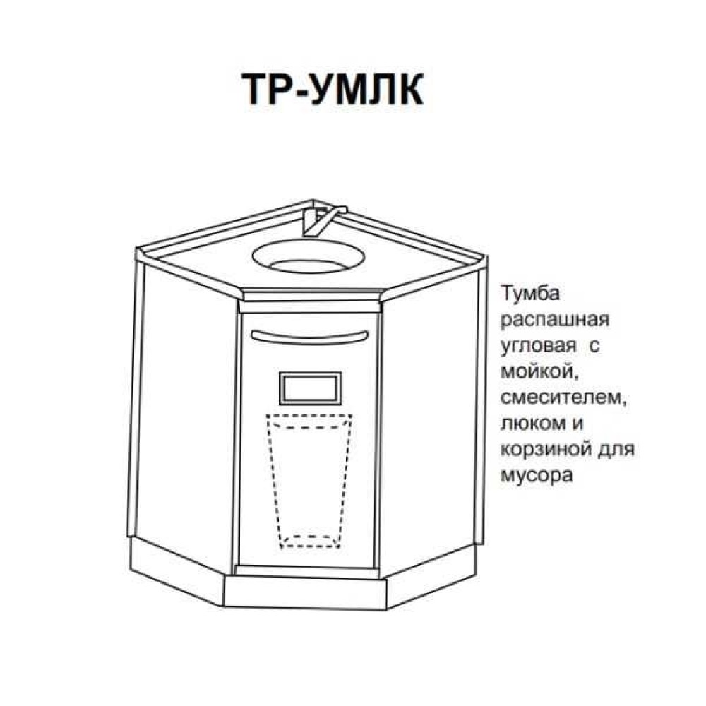 ТР-УМЛк - тумба распашная угловая с мойкой, смесителем, люком и корзиной для мусора 850х860х860 мм