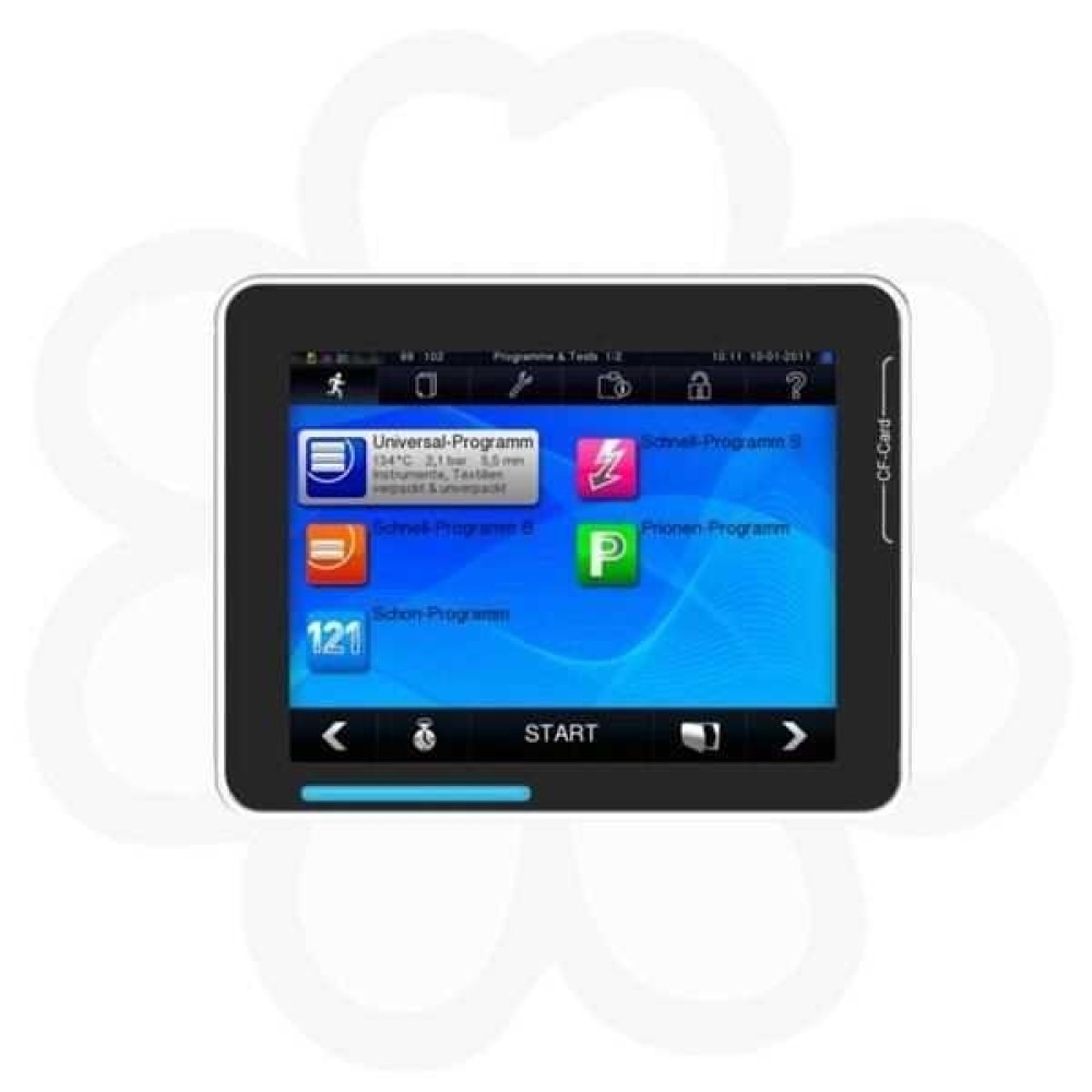Оператор лишь выбирает нужную установленную программу (из 5 программ стерилизации и двух тестовых программ) и нажимает Пуск. Очень большой графический дисплей делает управление чрезвычайно удобным. На дисплей выводится инструкция по эксплуатации, что позволяет избежать ошибок.